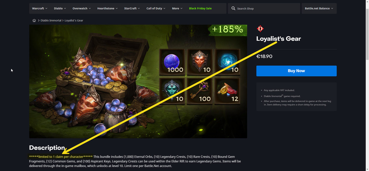 I bought 3 packages from the online shop on battle.net: the Loyalist’s Kit for €5.99, the Loyalist’s Pack for €9.39, and the Loyalist’s Gear for €18.90. All three packs contain orbs, legendary crests, normal gems, and other items; none of them are class-bound. I haven’t claimed the rewards on any character yet — the option to claim is only available on an alt, not on my main character. I spent about €35 to boost my main character, so it’s natural that I want to claim the purchased items on my main and not on some other character.