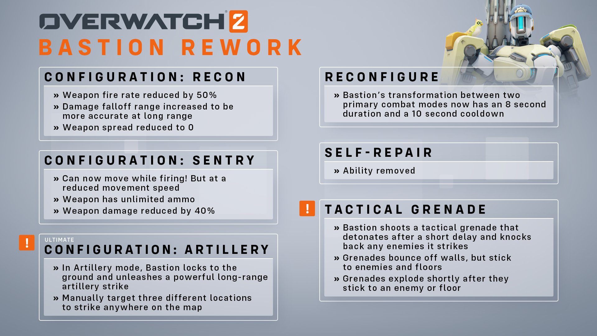 I’m loving the idea of giving Bastion an artillery mode. Definitely more consistently useful than Tank Mode, which tends to fizzle when people focus-fire him and requires him to get too close for it to be accurate.