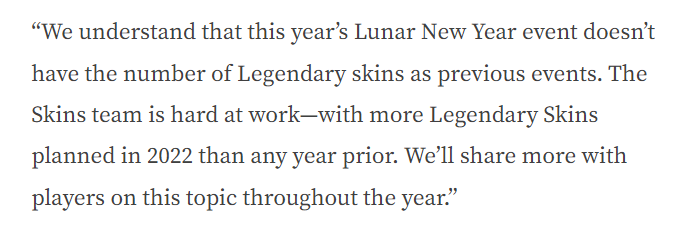 We understand that this year’s Lunar New Year event doesn’t have the number of Legendary skins as previous events. The Skins team is hard at work with more Legendary Skins planned in 2022 than any year prior. We’ll share more with players on this topic throughout the year.