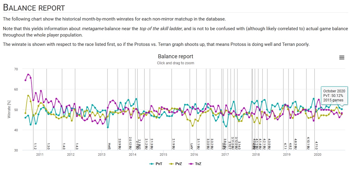 But what winrates ? As far as I know, upon selling the game the original balance team said that ±5% was acceptable for full ladder daily winrates, not for top of the ladder/progamer monthly average. Having PvZ (for example) at 45% one day with bronze to masters players isn’t the same than having progamers not managing better than 45% in a full month, IMO.