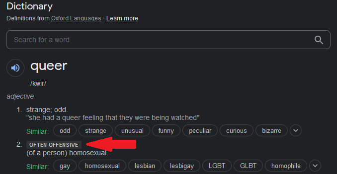 That was my impression. As I mentioned above, I wrangled the idea around a little with my wife, who is a sociologist and pretty dialed into these topics, to try to find the right terminology for what I was driving at without riling anyone up (well, without riling them up more than they otherwise would have). I was a little taken aback that “queer” is used so freely, and that “queer-code” is a term, given the history and usage it had when I was growing up.